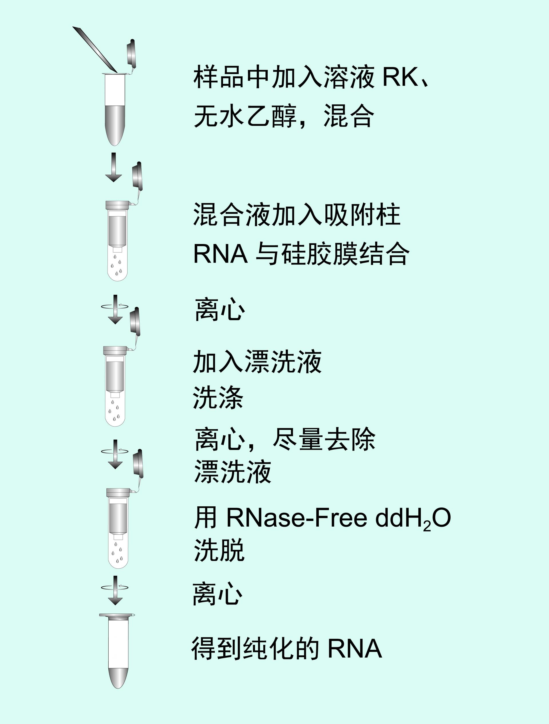 本试剂盒使用独特的离心吸附柱,在高盐条件下RNA与硅胶膜高效、专一地结合,同时有效去除蛋白质、无机盐离子和许多有机杂质等,处理的RNA样品量可多达 20 μg。